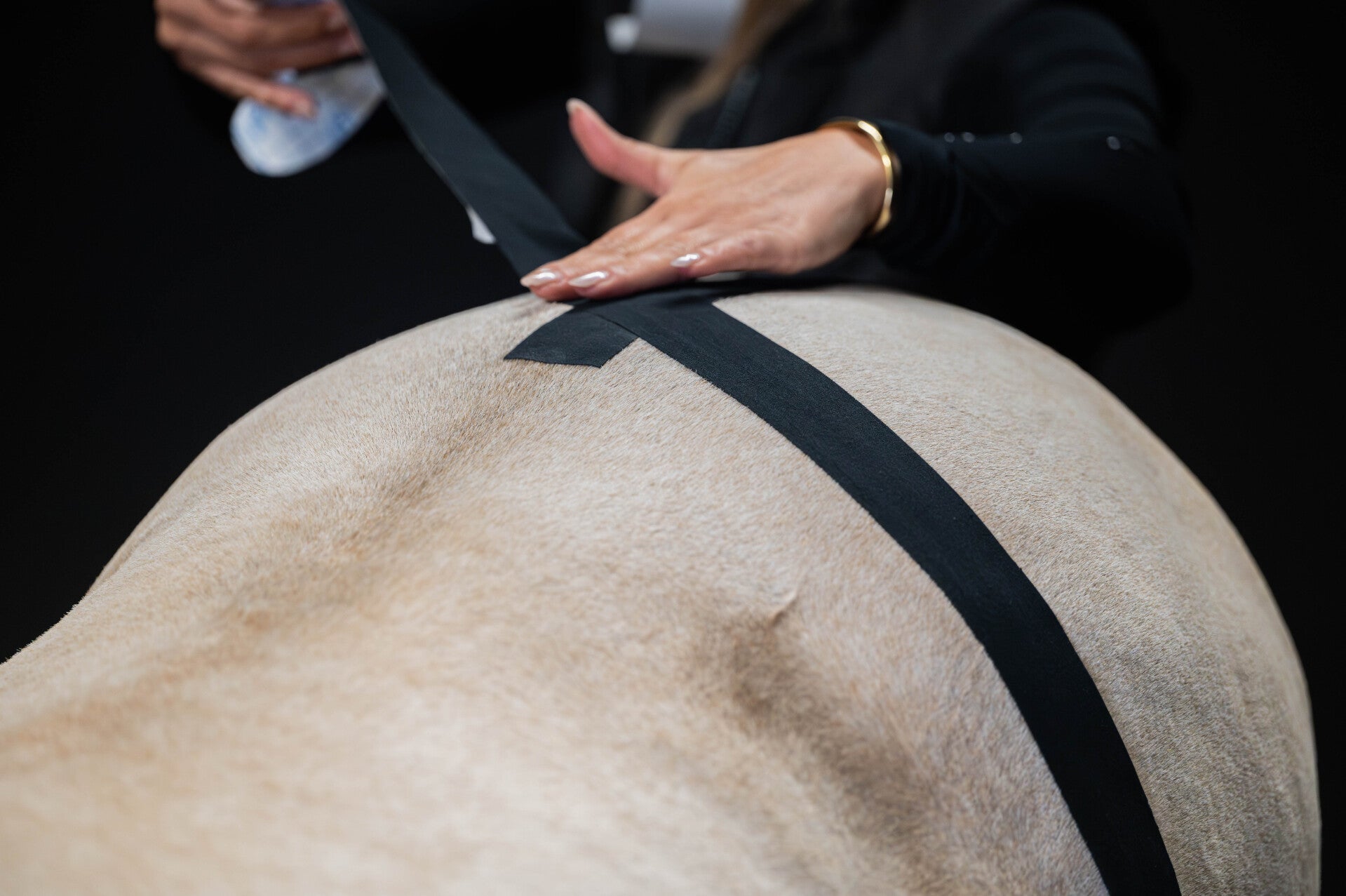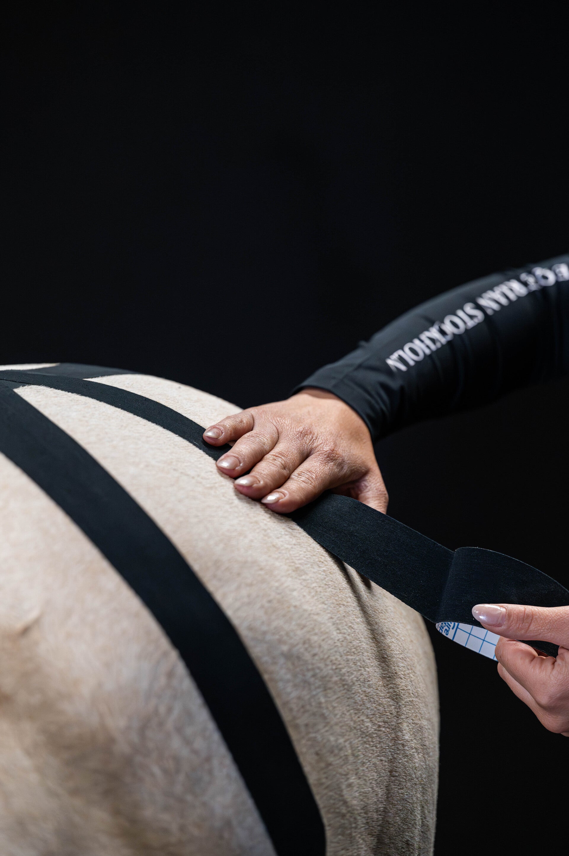 - Het is belangrijk om de tape correct aan te brengen door een professional, zoals een dierenarts, paardenfysiotherapeut of -masseur, die ervaring heeft met medical taping bij paarden.